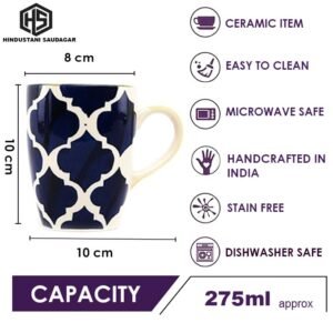 The Blue Umrao Coffee Mug Set (275 ml each) is a must-have for modern homes and offices, blending elegance with functionality. Featuring a striking blue umrao exterior and a smooth, glossy white interior, these cups add sophistication to any setting. Designed for comfort, the heat-insulated handle ensures a secure grip without getting hot, while the thoughtful hook point holds tea bags effortlessly. Durable, easy to clean, and both dishwasher- and microwave-safe, they are perfect for coffee, tea, hot chocolate, and more. Ideal for everyday use or gifting on special occasions, these cups bring warmth and charm to every sip. Inspired by our journeys across India, hindustani saudagar celebrates artistry and heritage, bringing handcrafted treasures to your home.