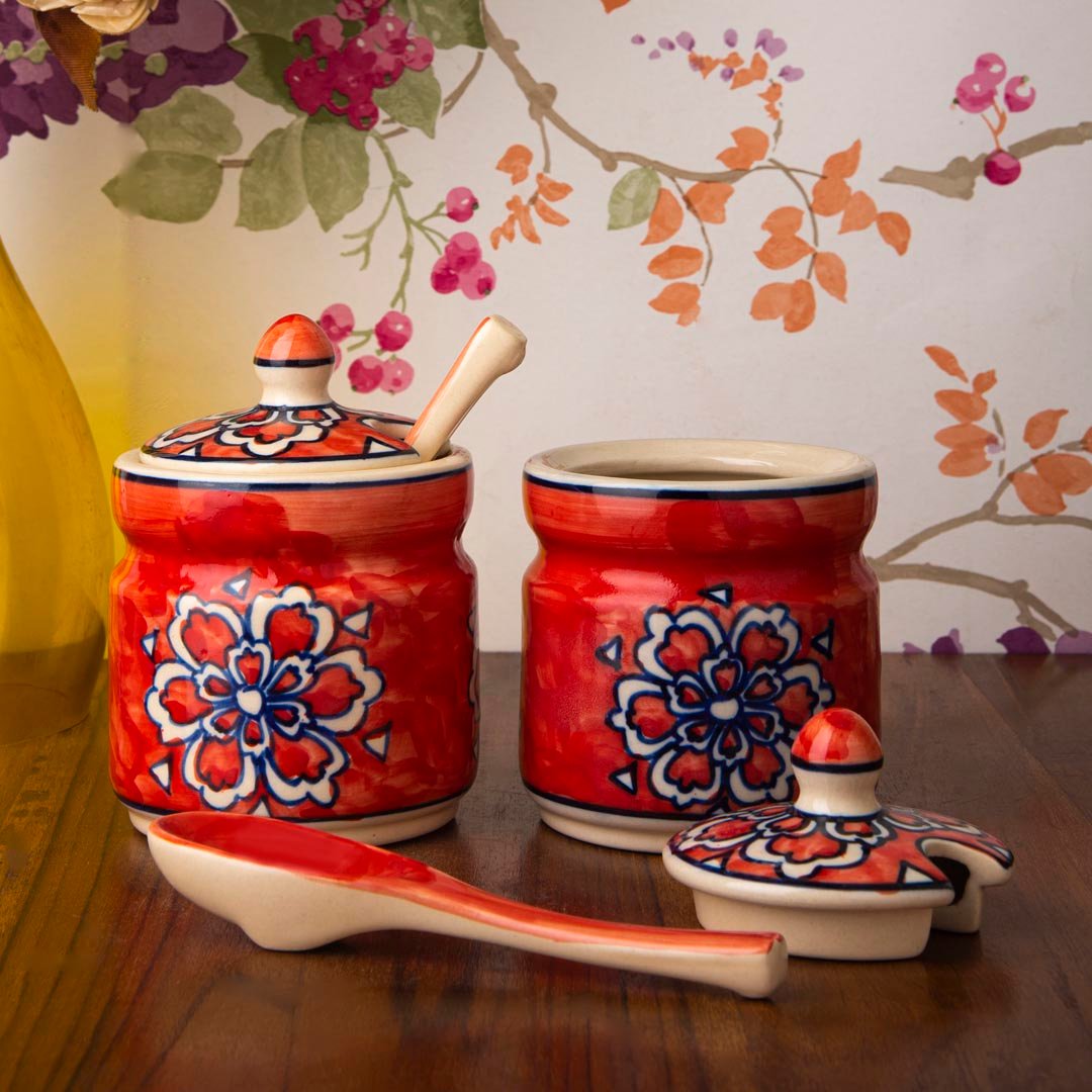 The Royal Red Mughal jar set beautifully designed for both home utility and decor. Each jar, with a capacity of 300 ml, is carefully made by rural artisans using traditional pottery techniques and finished with vibrant glazes. These versatile jars are perfect for storing spices, pickles, pulses, sugar, tea or coffee, salt, sugar ghee, oil, and dry fruits come with lids that help preserve freshness and aroma. With their artistic. designs and perfect construction, they not only serve as practical kitchen organizers but also double up as elegant home decor pieces. Perfect for your kitchen, dining table or gift box – this ceramic jar set is a celebration of heritage. Bring home the charm of Indian craftsmanship.