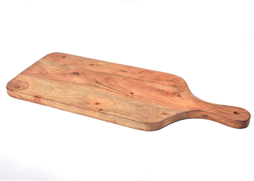 - Acacia wood construction- This cutting board is made of acacia wood. Acacia is famous for being virtually indestructible. The wood has a beautiful natural polish and a sweet smell and can withstand the demands of weighted objects making it perfect for carving meats/vegetables