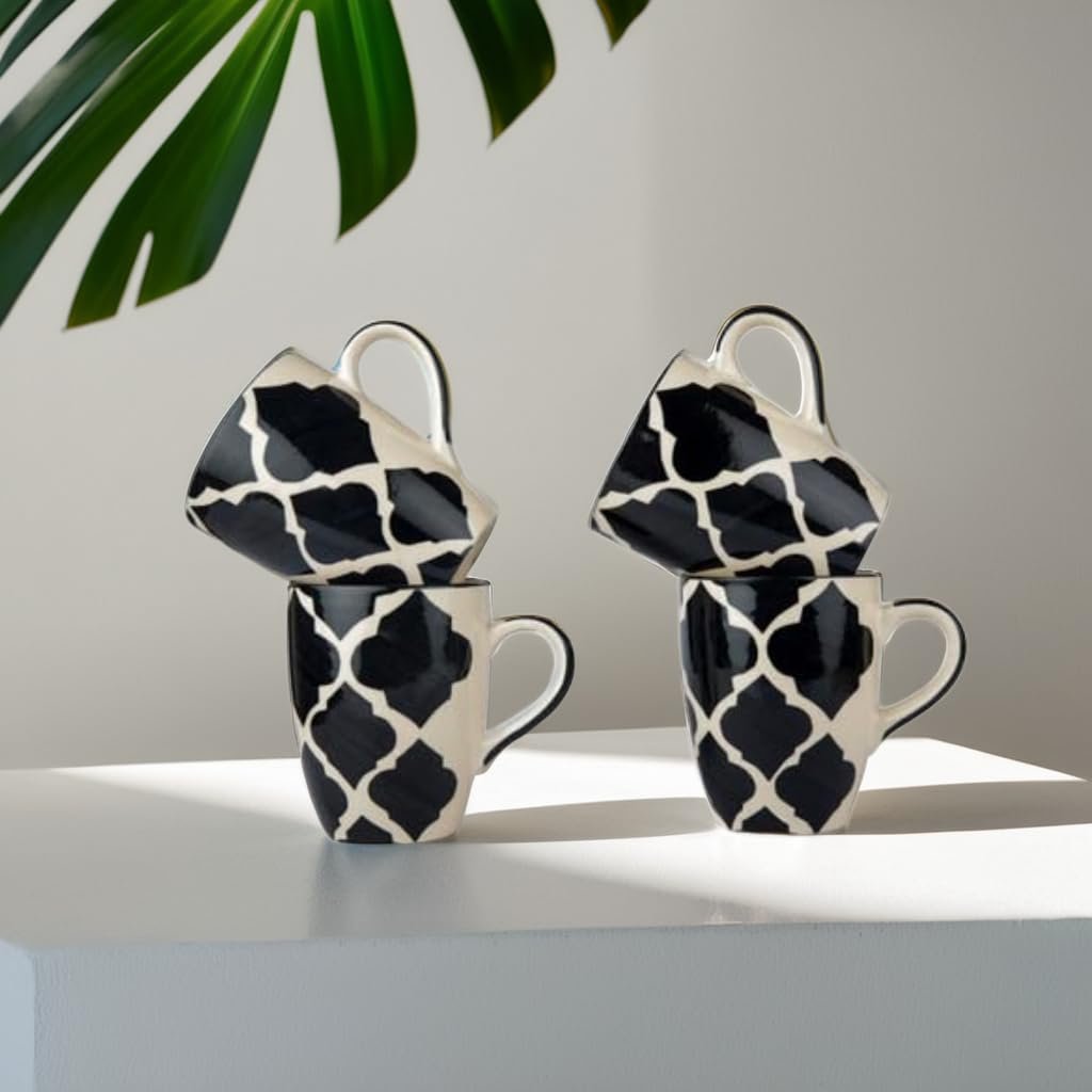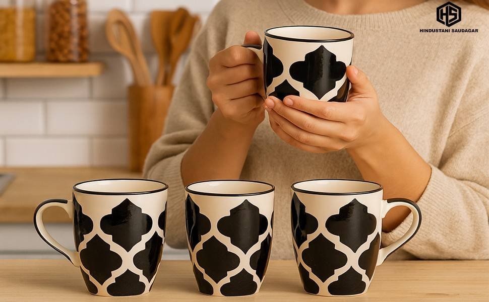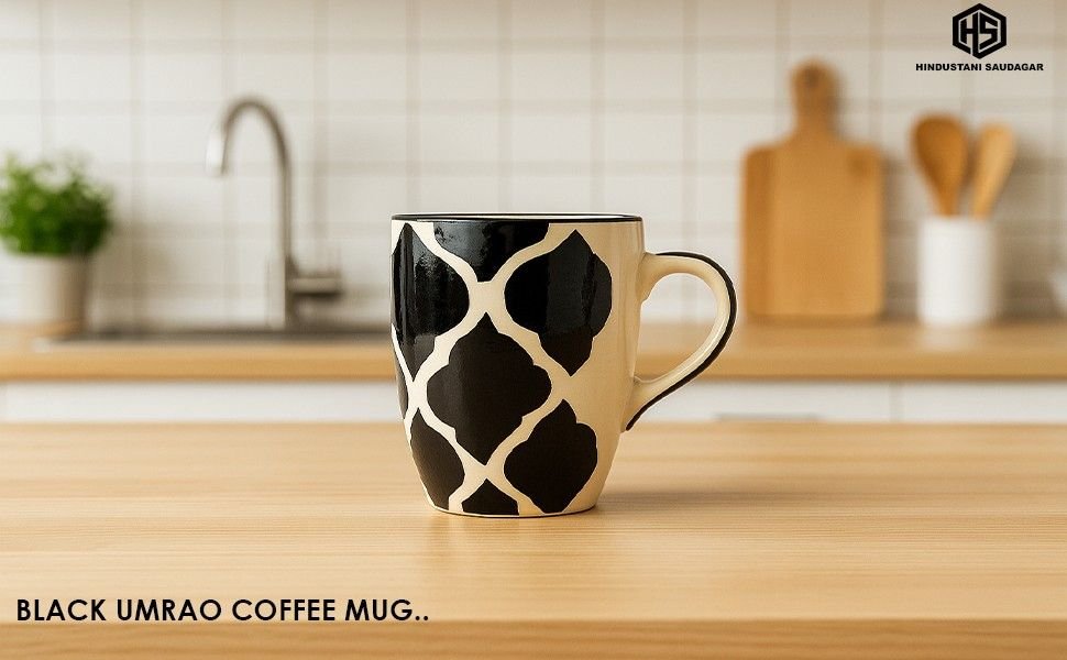The Black Umrao Coffee Mug Set (275 ml each) is a must-have for modern homes and offices, blending elegance with functionality. Featuring a striking black umrao exterior and a smooth, glossy white interior, these mugs add sophistication to any setting. Designed for comfort, the heat-insulated handle ensures a secure grip without getting hot, while the thoughtful hook point holds tea bags effortlessly. Durable, easy to clean, and both dishwasher- and microwave-safe, they are perfect for coffee, tea, hot chocolate, and more. Ideal for everyday use or gifting on special occasions, these mug bring warmth and charm to every sip. Inspired by our journeys across India, hindustani saudagar celebrates artistry and heritage, bringing handcrafted treasures to your home.