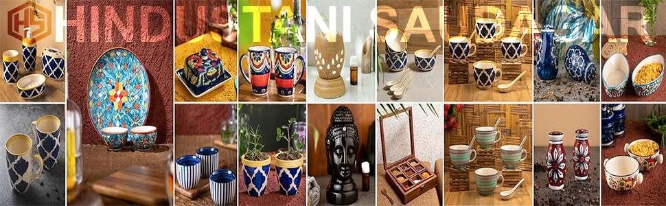 The ceramic mug from HS Hindustani Saudagar has a height of 10 cm, a top diameter of 8 cm, and a base width of 10 cm, with an approximate liquid capacity of 275 ml. It is designed with a comfortable handle and handcrafted in India.